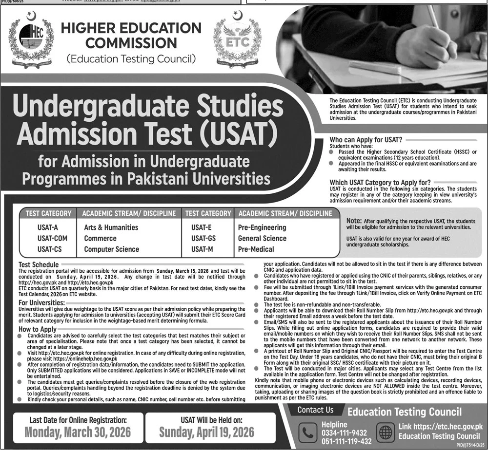 For students finishing their high school journey in Pakistan, the transition to university is a milestone. One of the most critical steps in this journey is the Undergraduate Studies Admission Test (USAT). Organized by the Higher Education Commission (HEC) through the Education Testing Council (ETC), the USAT has become a standardized gateway for dozens of universities across the country.