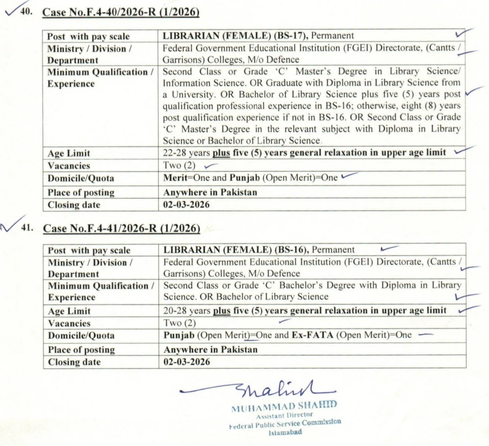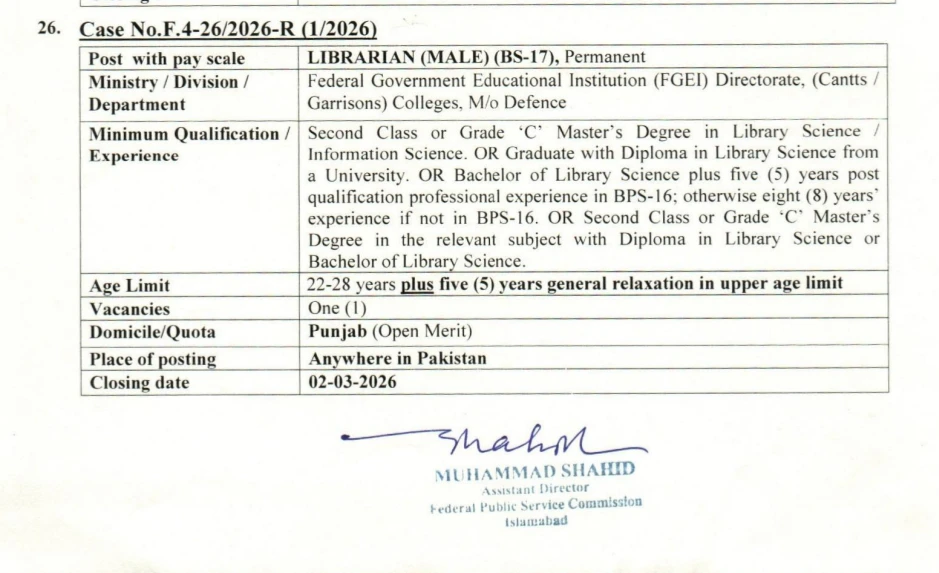 These jobs are part of the first phase of the 2026 recruitment drive by the Federal Public Service Commission. The details for each category of the Librarian post are given below.